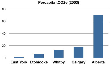 On the other hand, Calgary had emissions of 17.7 tCO2e per capita in 2003 and as noted above, the province of Alberta had 70.1 tCO2e.