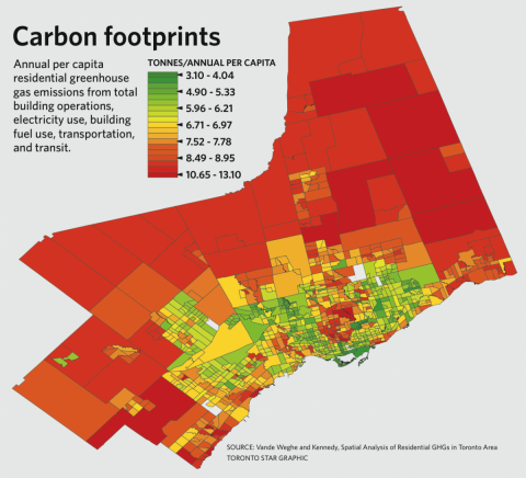 Emissions also vary significantly at the neighbourhood level, as shown in a study by VandeWeghe and Kennedy of consumption-based household emissions and production-based transport emissions by census tract for the city of Toronto. On average, residents in the city core produced 6.42 tCO2e per capita compared to 7.74 tCO2e per capita for residents in the surrounding suburbs. However, there were pockets within the city core that produced emissions as high as those in the suburbs; these census tracts represented wealthy neighbourhoods, characterized by high automobile use and older, inefficient homes. The lowest emissions were 1.31 tCO2e per capita for a dense inner-city neighbourhood with good access to public transportation. The highest emissions were 13.02 tCO2e per capita in a “sprawling” distant suburb.