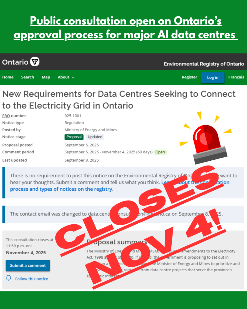 Volunteer: To get involved in climate action and organizing around AI data centres in Ontario, sign up in the form here.