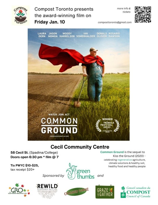 When: Survey is available until January 31, 2025. (Note: There are pop-up sessions throughout the month, hosted by city staff; scroll down to find one near you. Also, keep scrolling for information on Compost Toronto 's presentation of "Common Ground" - an award-winning film - on January 10. |