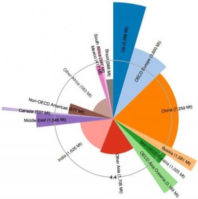The chart represents IEA Emissions by country. The wedges in this chart represent the percapita emissions (radius), population (andle) and total emissions (area). The emphasis should be on percapita since it is not fair to compare countries with large populations to those with smaller populations. The obligation should be on countries such as Canada to reduce our percapita emissions. The grey circle represents the average global percapita emissions. The chart is based on IEA figures from 2010 (the most recent.) NOTE: Canada is the mauve wedge sticking out between the Middle East and Non-OECD Americas. The numbers on each wedge are the total emissions for that country. Canada's were 575 Mega tonnes in 2010.